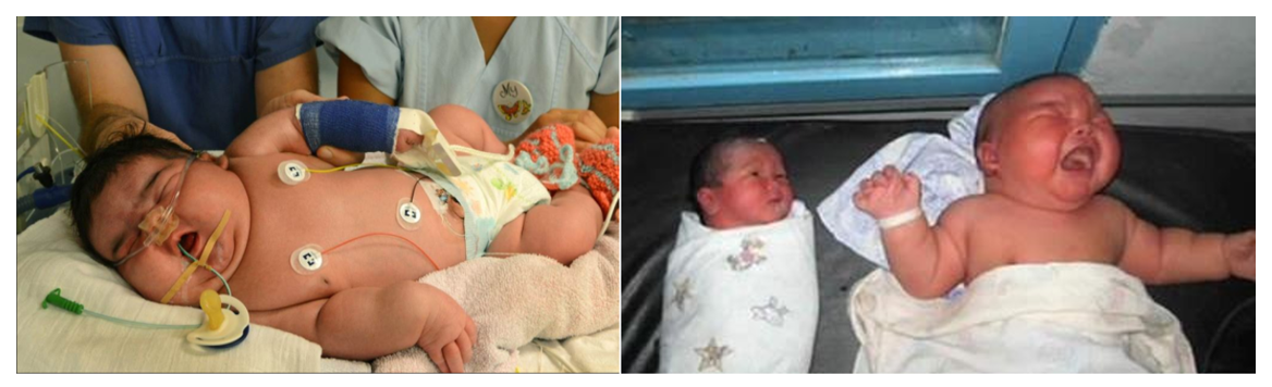 يولد الطفل بحجم كبير و وزن أعلى من المعدل الطبيعى . ضعيف الحركة كما أن هناك احتمال تواجد سوائل مرتشحة فى الجهاز التنفسي و الهضمى وميل للقئ و الزرقة فى اللون و التشجنات و احتمال ظهور عيوب خلقية فى أى من أجهزة الجسم العديدة و لكل هذه الاحتمالات فإن الطبيب المشرف على التوليد يهتم تماماً بضبط معدل السكر فى دم الأم طول مدة الحمل كما نجده يصر على أن تكون ولادة الأم فى المستشفى حيث الإشراف الطبى المتكامل و إمكان شفط فم و حلق الطفل و تكرار ذلك كلما لزم الأمر و إعطاء محلول الجلوكوز و غيره حسبما يرى طبيب الأطفال. فإذا حدث و ولد الطفل قبل موعده فى المنزل فمن الواجب الإسراع بنقله إلى المستشفى مع مراعاة المحافظة على الفم و الحلق خاليين من السوائل و الإفرازات و جعل الرأس فى مستوى منخفض عن الجسم لاستخراج أى سوائل متجمعة فى الصدر أو المعدة بسهولة و دون أن يشرق الطفل بها . وعند وصول الطفل إلى المستشفى فسيتولاه الطبيب المتخصص ليومين أو ثلاثة يعود بعدها لأمه سليماً و يعامل مثل باقى الأطفال من ناحية الرعاية و التغذية .